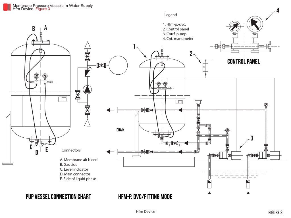 HFm devices are, prior to the start of operation and upon a completed assembly, filled with a gas up to the pressure set by the project as "preliminary pressure for filling". When the system is set into operation, the liquid with the pressure higher than this enters the vessel, raising its pressure to the pressure that the system itself is on at that moment. If this is lower than the required (set) pressure, the automation immediately sets the pumps into operation. The pumps then get excess water into the hydrofor vessel raising the pressure in it and when this is levelled