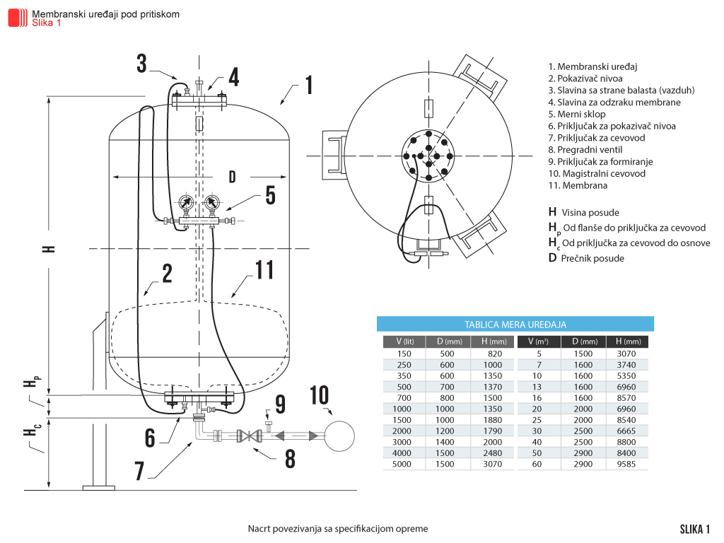 Kompenzacioni membranski uređaji su čelični uređaji odgovarajuće konstrukcije, određenim nominalnim pritiskom, sa ugrađenom membranom koja deli prostor posude na dva dela, za gas i tečnost podjednako, gde se prvi koristi za kompenzaciju skoka pritiska a drugi za akumulaciju tečne mase. Posude ovog tipa rade pod pritiskom i podpadaju pod inspektorat parnih kotlova i akreditovanog tela. Dimenzije i zapremine ovih posuda su date u slika 1 (druge mere i zapremine dostupne na zahtev).